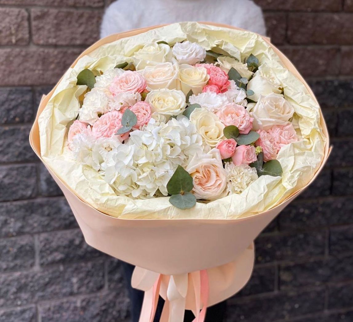 Белые розы и эустома образуют воздушный объем, где каждый бутон дышит свободно. Диантус добавляет графичности, а эвкалипт создает прохладную дымку по краям. Букет для тех, кто ценит легкость и современную флористику.