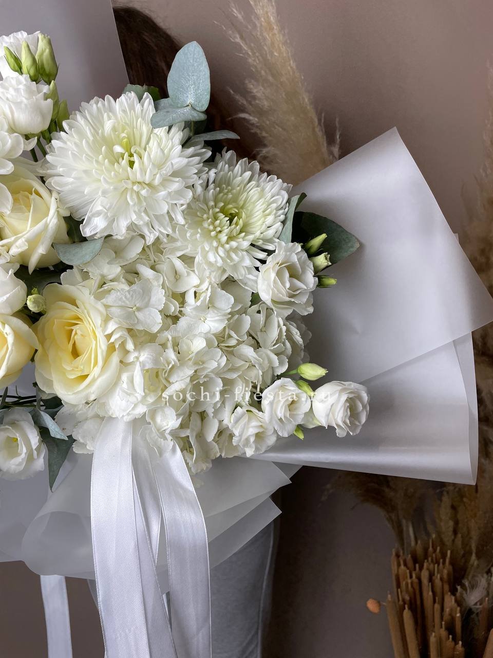 хризантема кустовая, диантусы, эвкалипт, оформление.