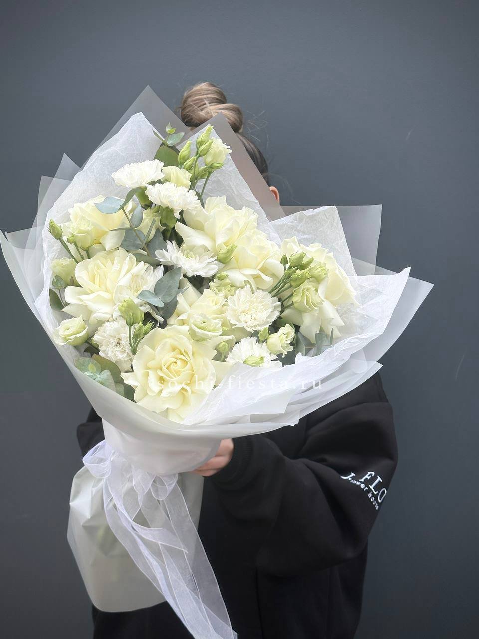хризантема кустовая , эустома , озотамус, диантус в воздушном оформлении с эвкалиптом.