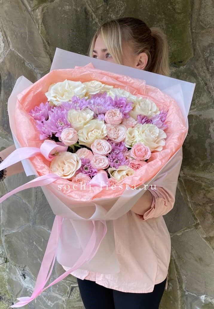 роза, хризантема, кустовая роза, эвкалипт, лента, упаковка.
