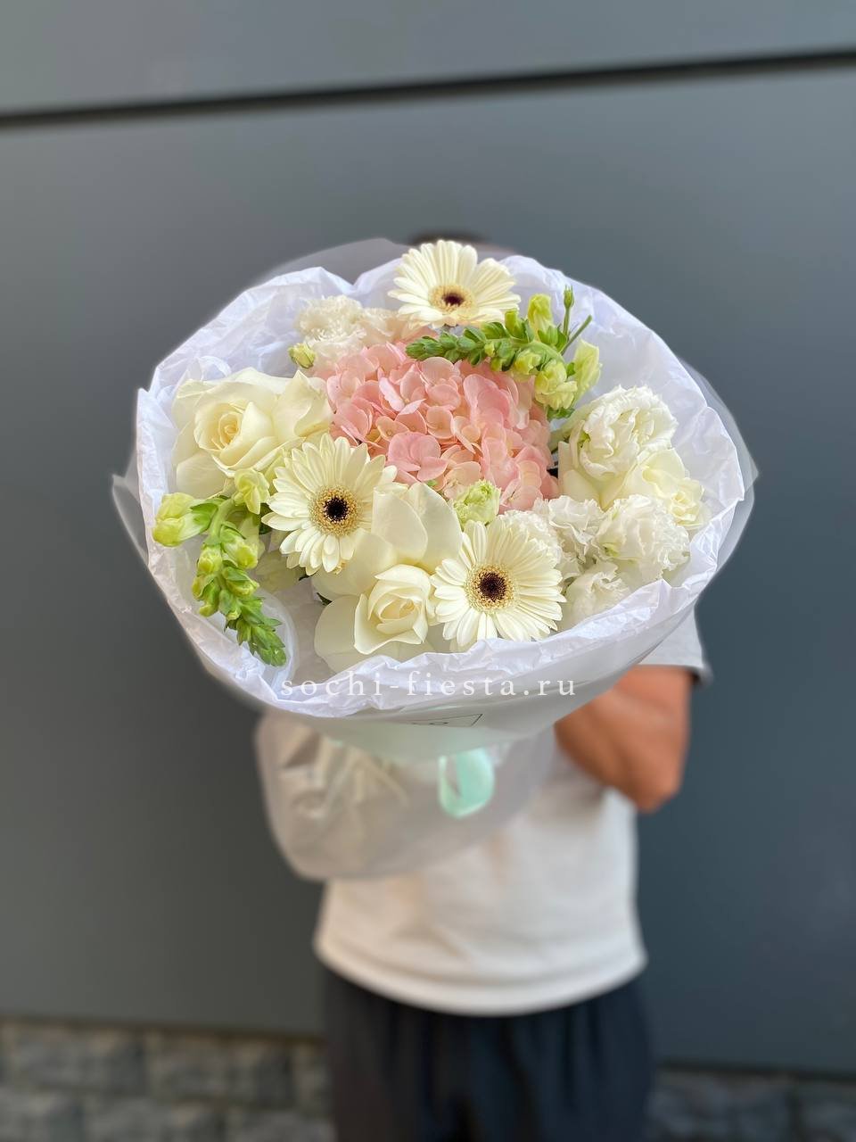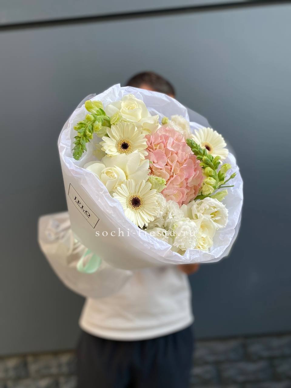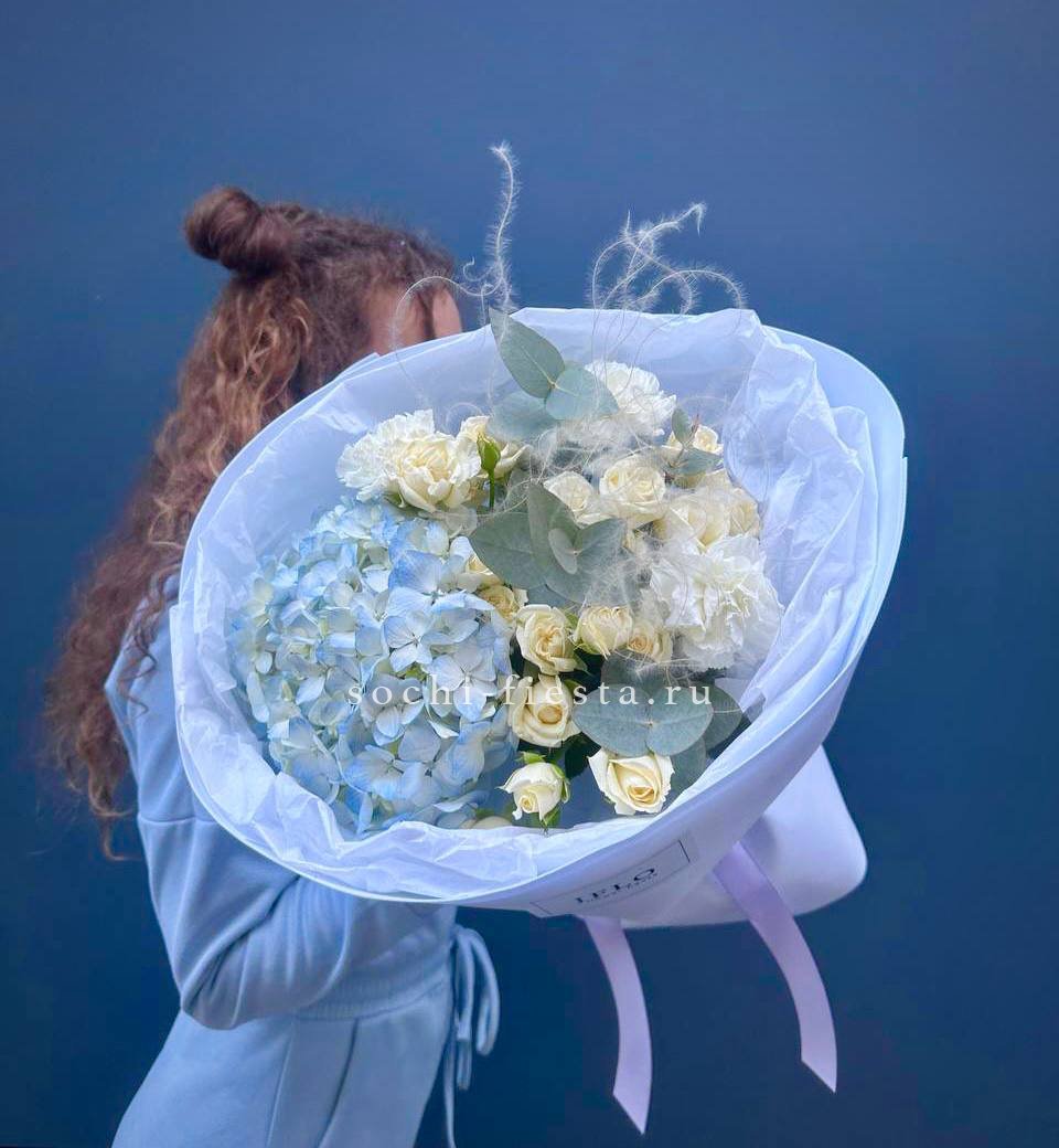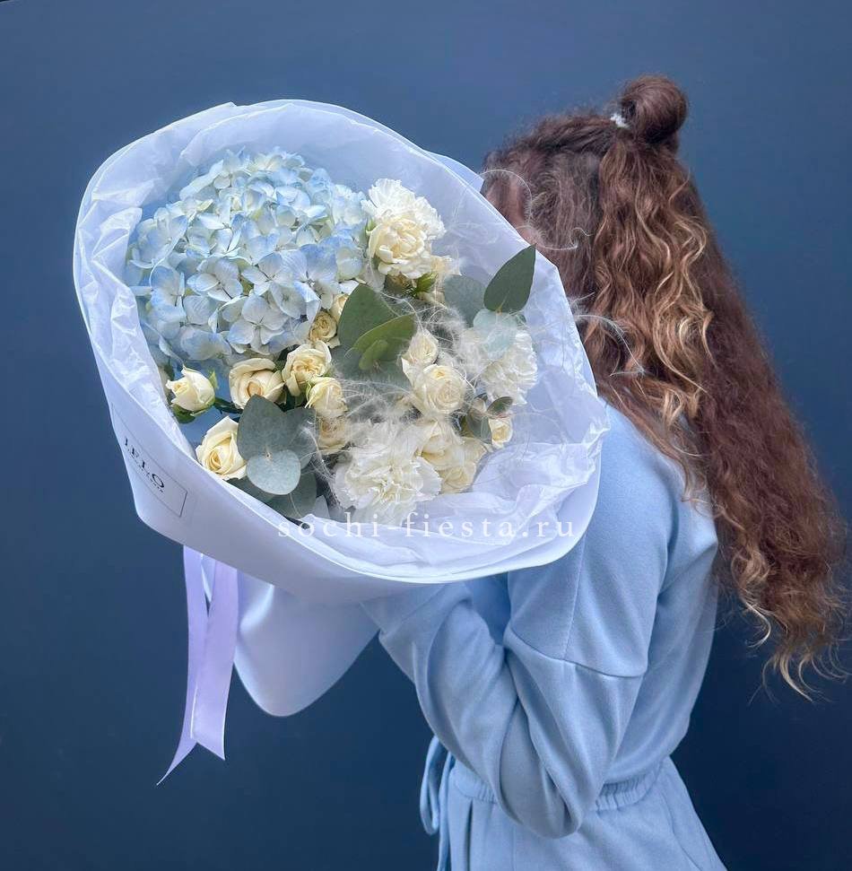 Пышные шапки гортензии задают объём, а россыпь кустовых роз создаёт живую текстуру по всей форме. Композиция наполнена воздухом и естественной лёгкостью.