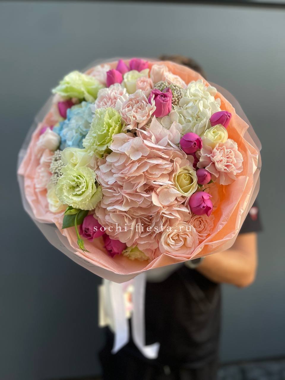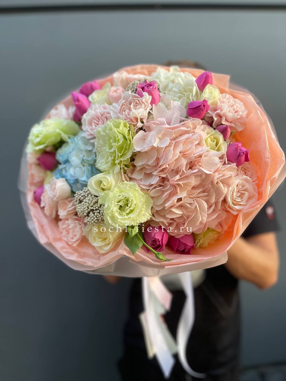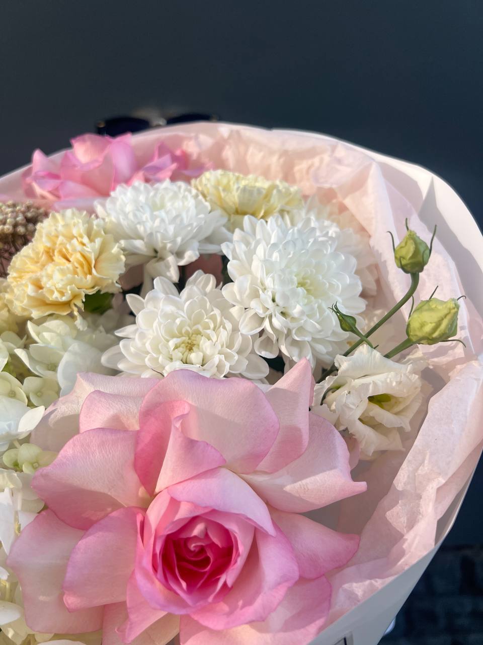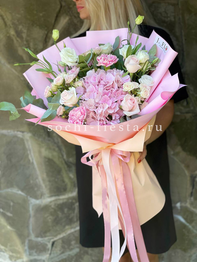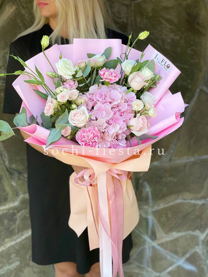гортензия, диантус, хризантема, эустома, розы, озатамус, пленка.