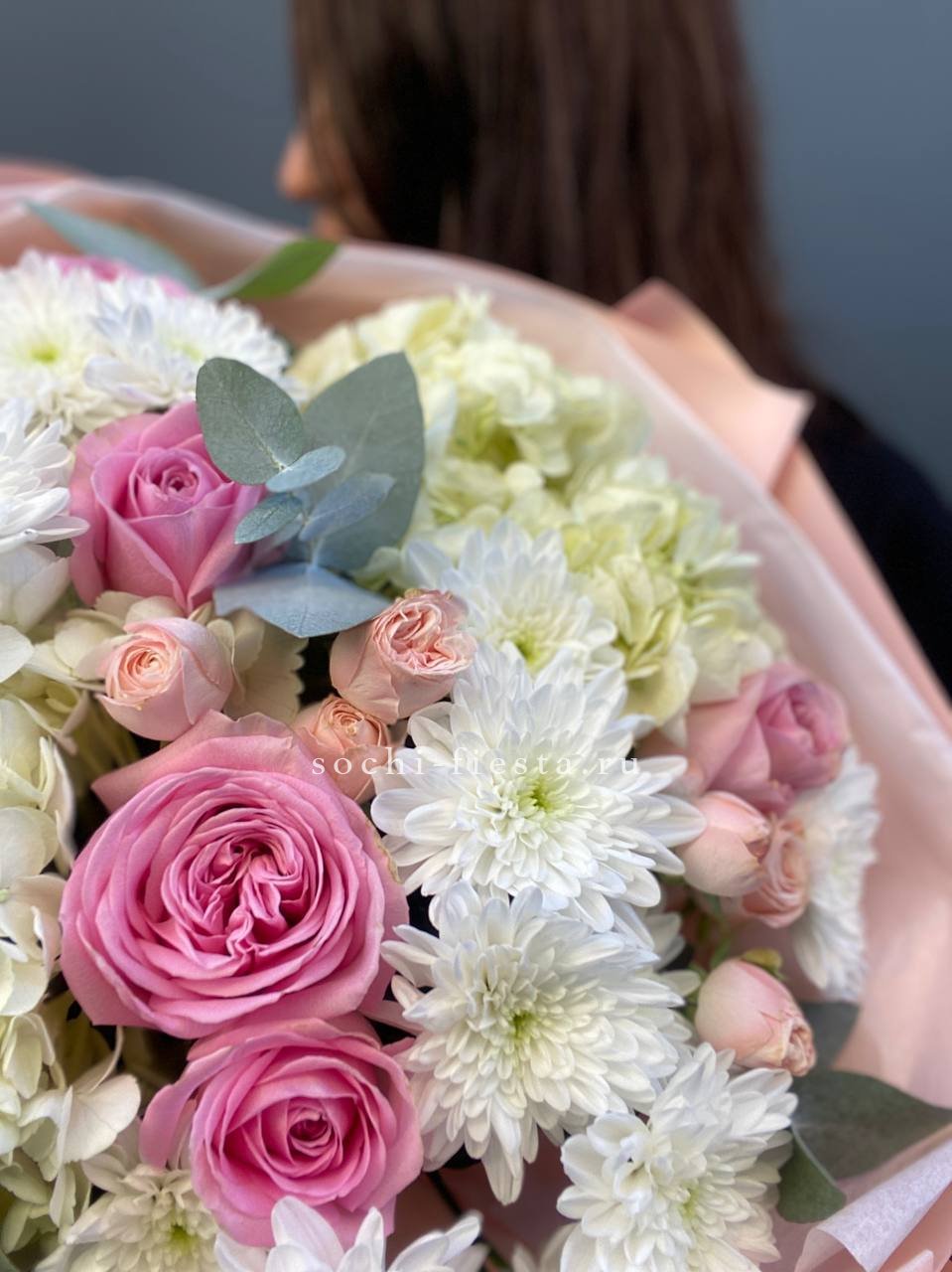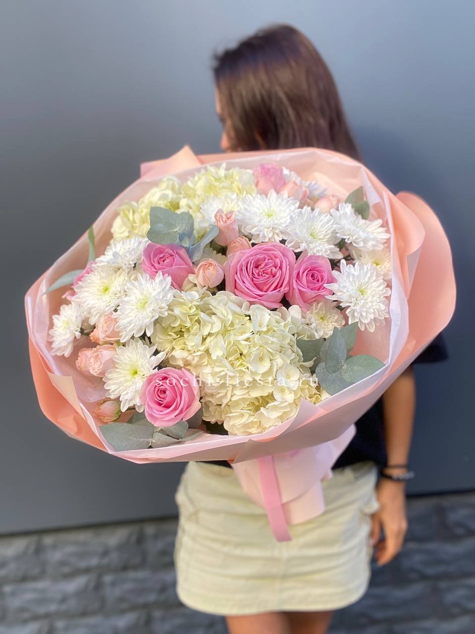 Пастельные оттенки гортензий переплетаются с белоснежными хризантемами, создавая воздушную дымку. Мягкие переходы тонов напоминают утренний туман над садом.