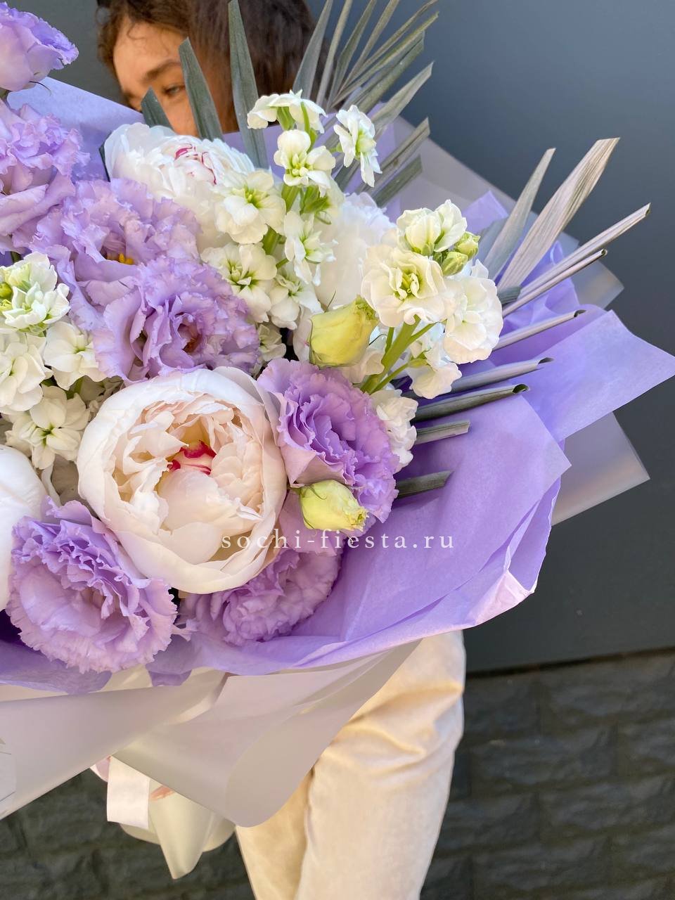 Пионы и эустома собраны в свободную форму где каждый бутон раскрывается в своём ритме. Маттиола и чико дополняют букет мягкими линиями и природной непринужденностью.