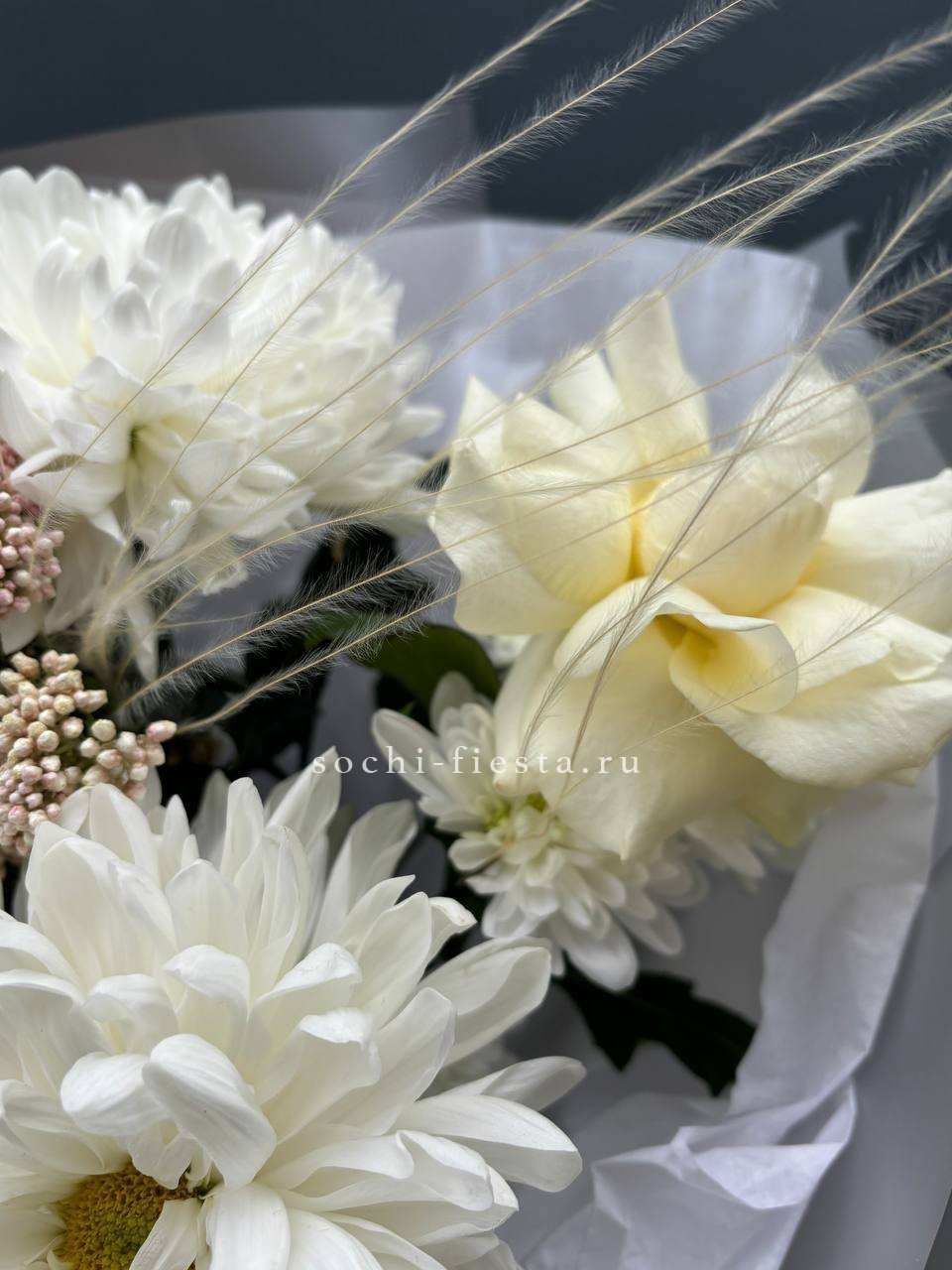 хризантема кустовая, гортензия, мисти баблс, розы в нежном оформлении.