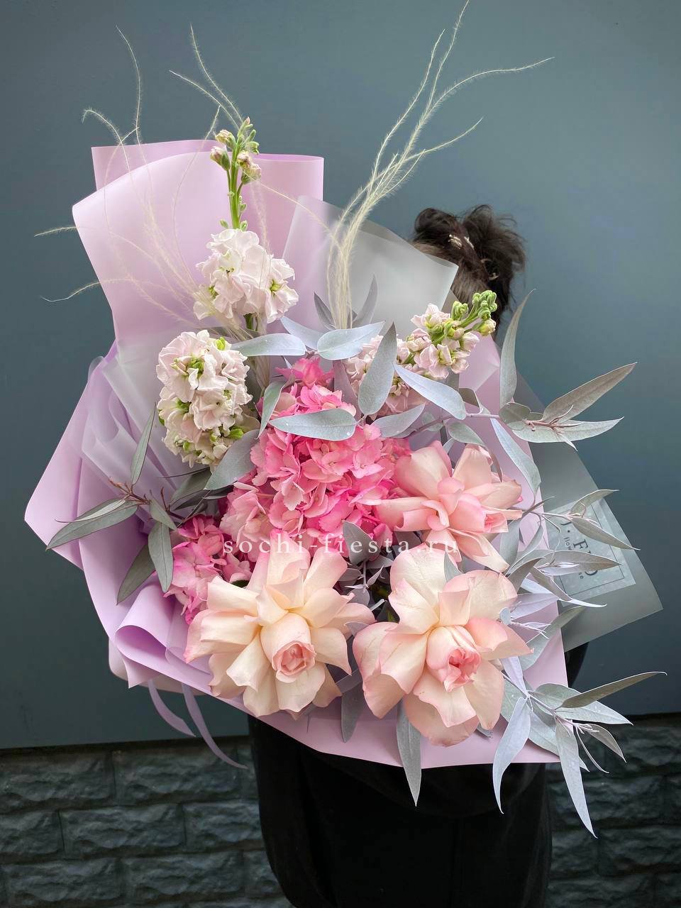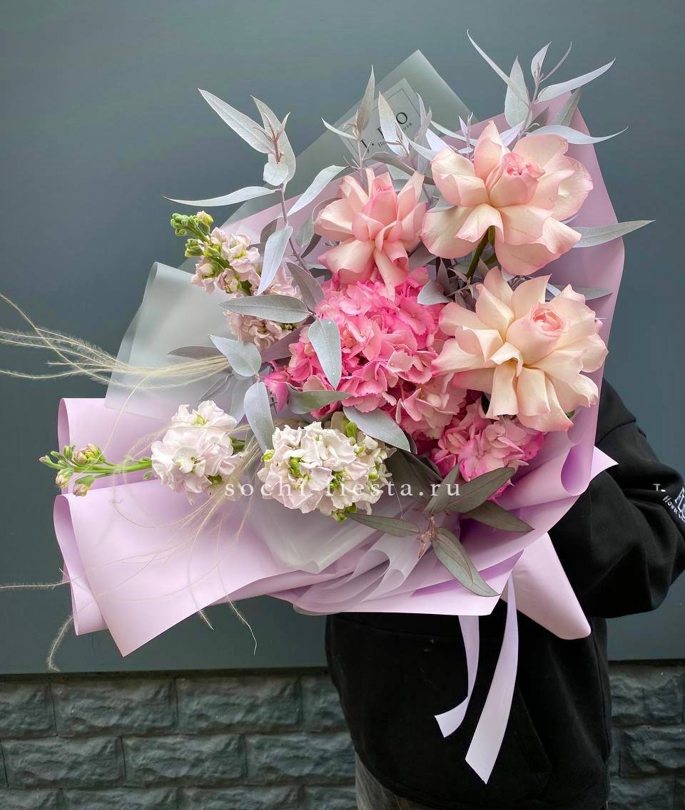 Гортензия образует пышную основу, сквозь которую проступают светлые головки эустомы и роз. Бомбастик вносит графичность, создавая объём и глубину.