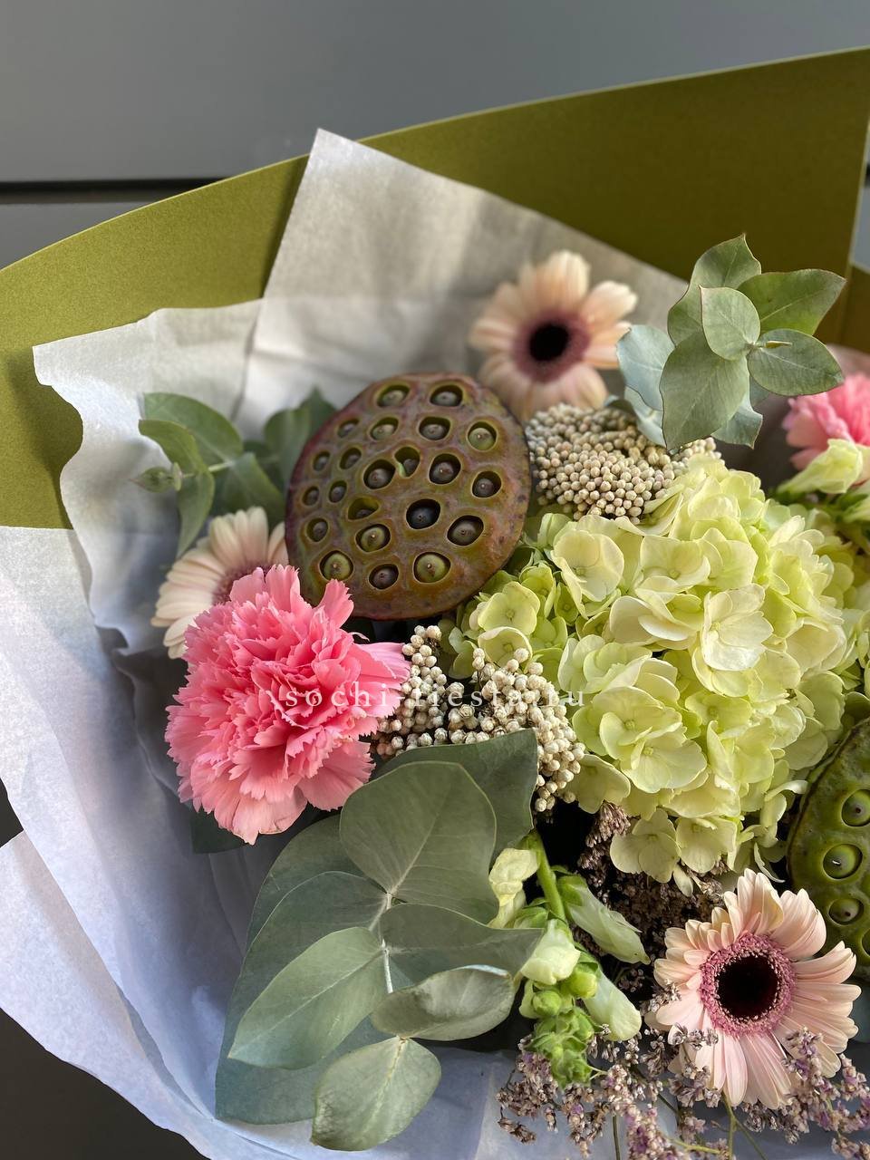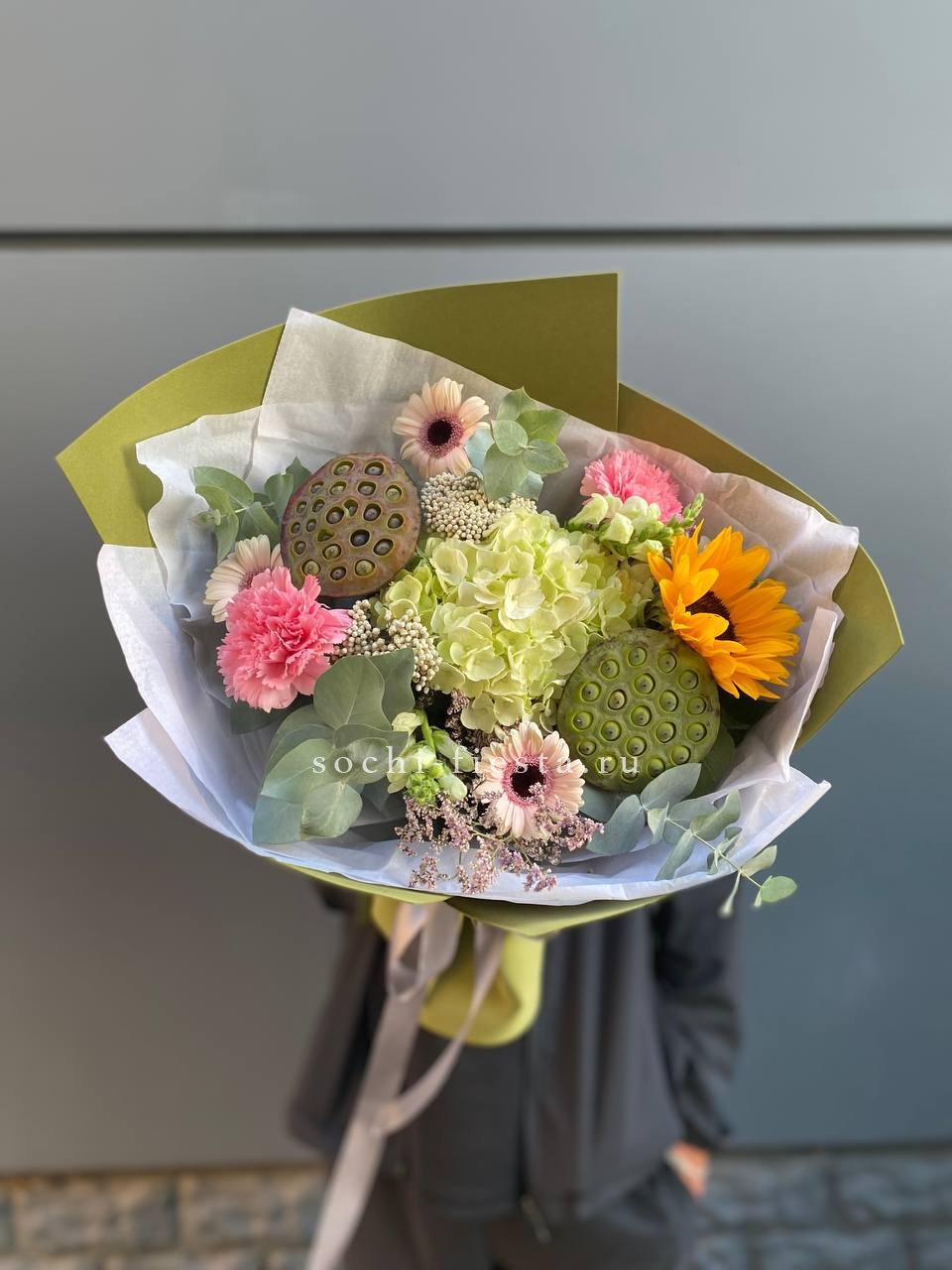 лотос, антирринум, диантус, подсолнух, озатамус, гортензия, гербера, лимониум, упаковка.