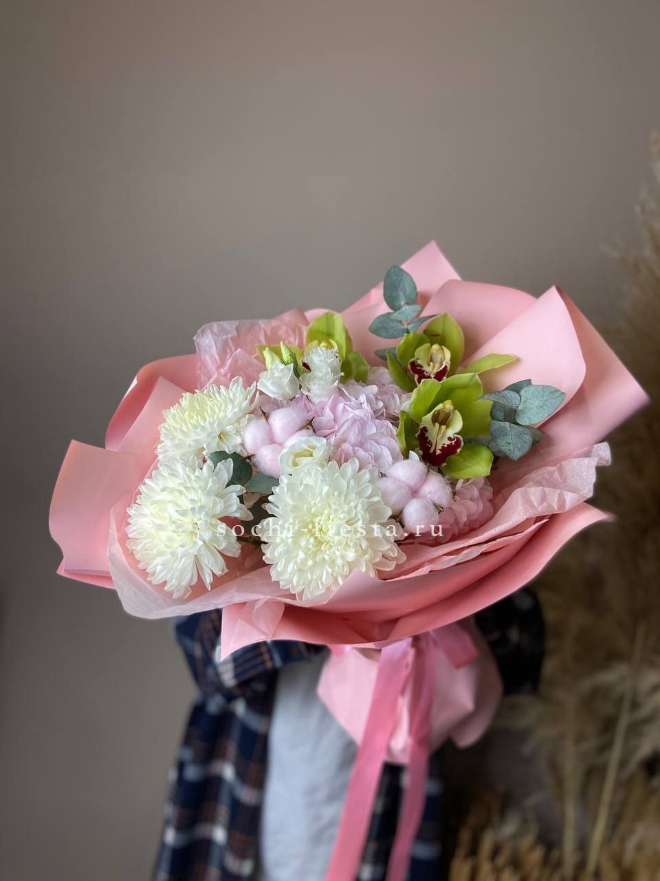 орхидея, гортензия, эустома астра, хризантема, хлопок, эвкалипт, лента, дизайнерская пленка.