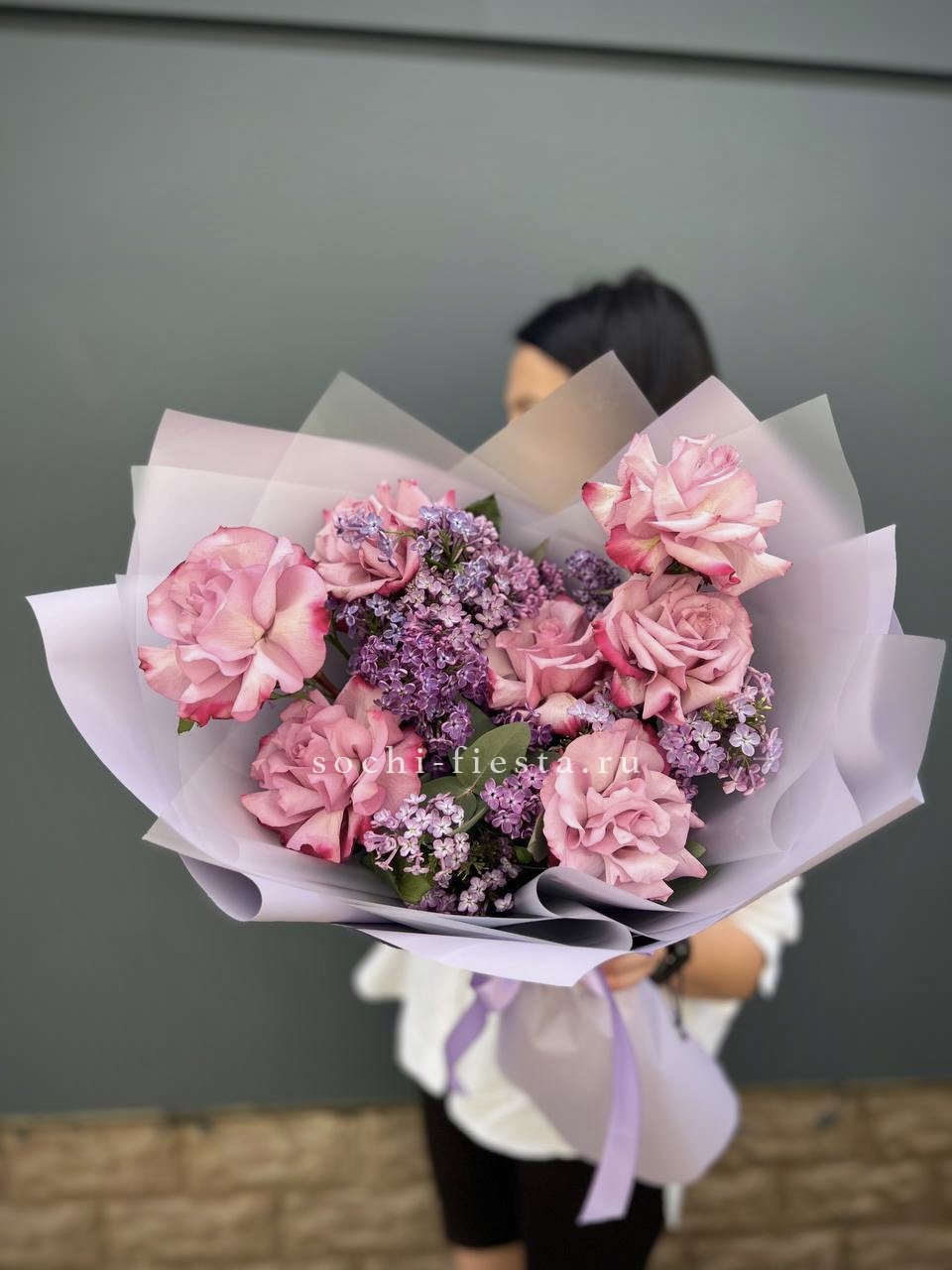 Розовые розы соседствуют с душистыми гроздьями сирени, создавая весеннее настроение даже в будний день. Эвкалипт добавляет свежести и завершает композицию спокойным зеленым фоном.