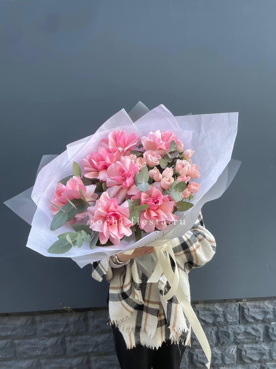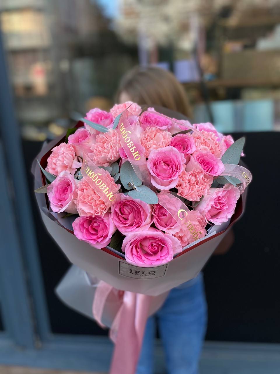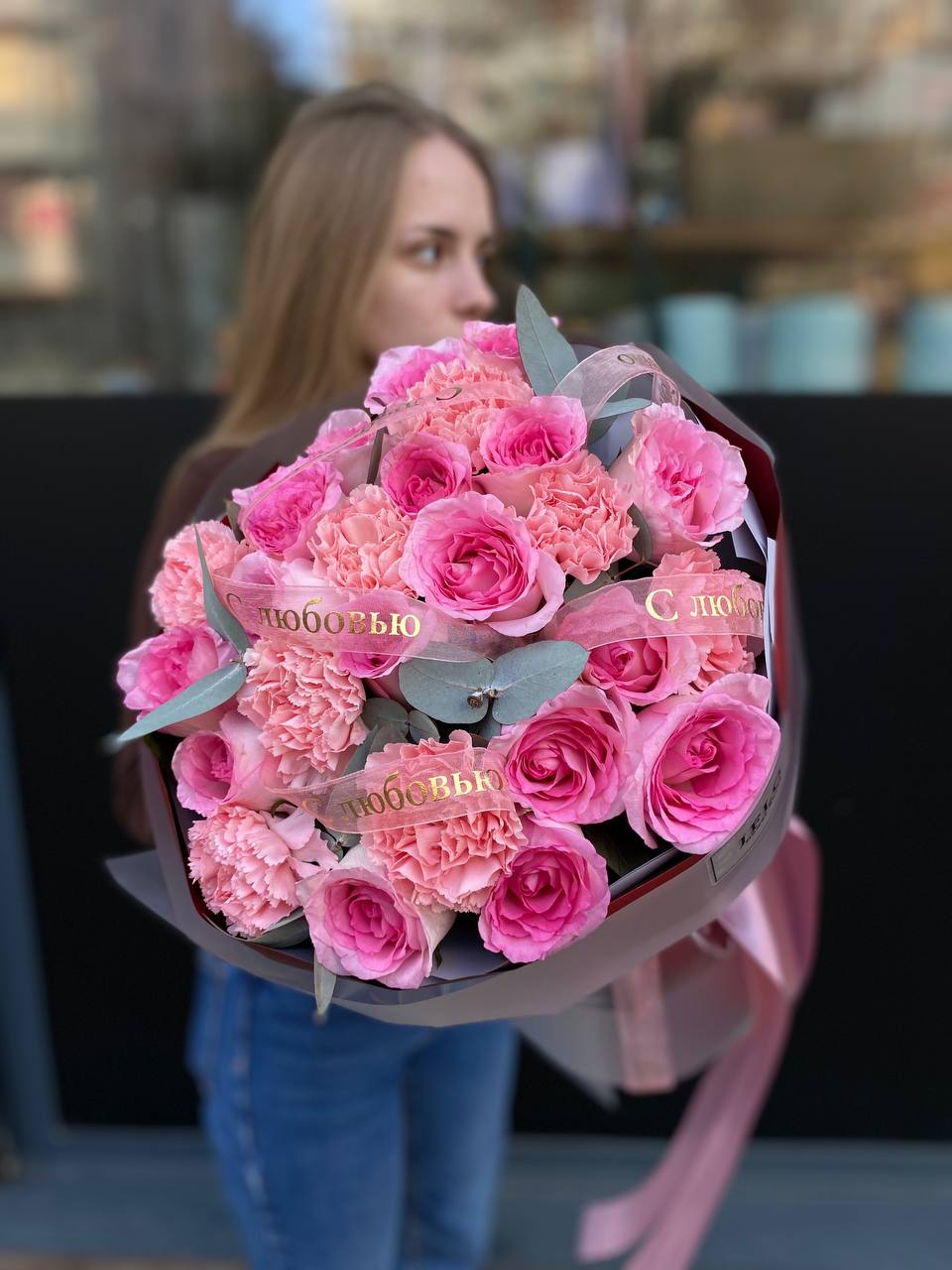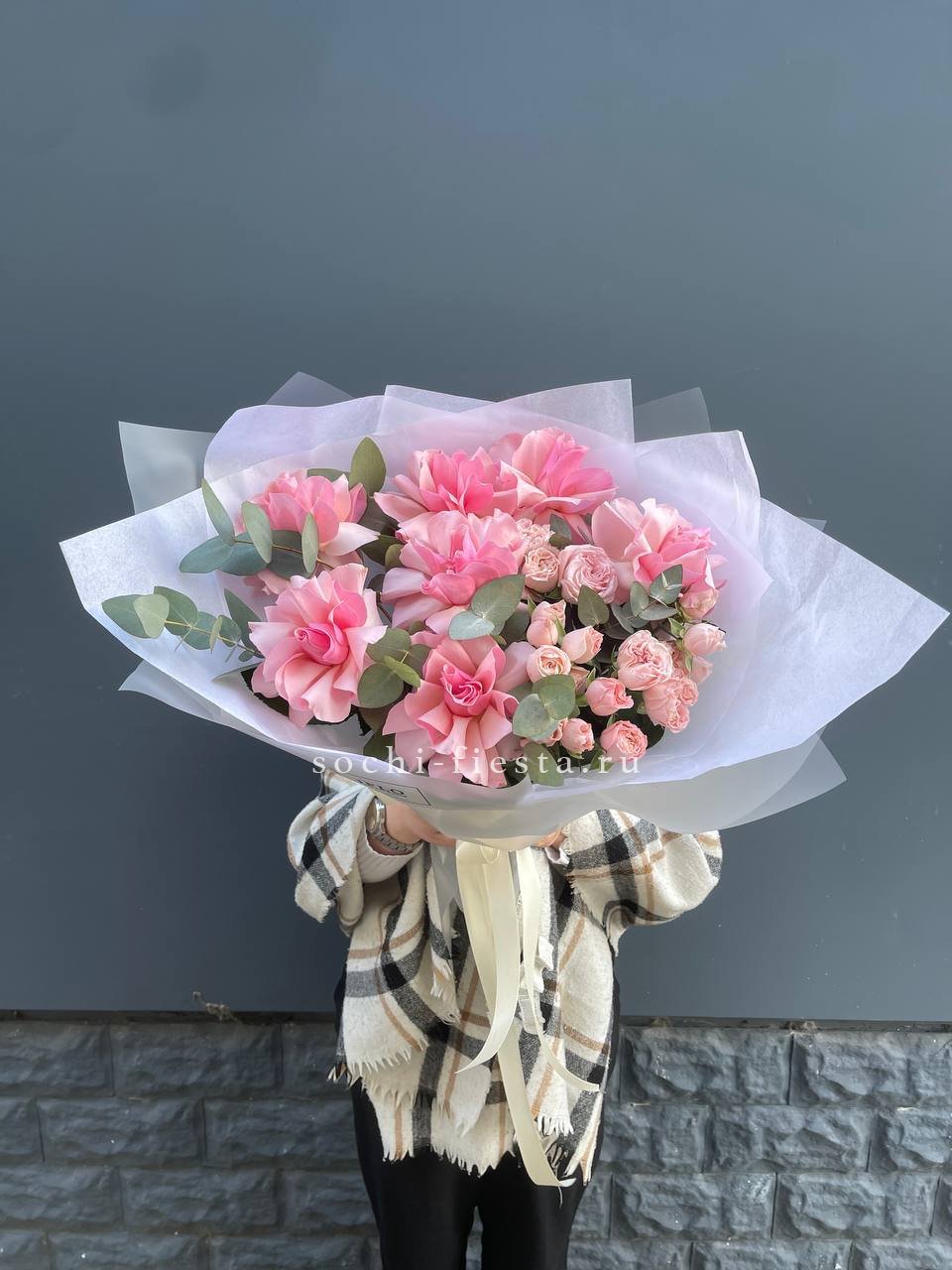 розы одноголовые, кустовые розы, озотамнус, диантусы, эвкалипт, лента, дизайнерская упаковка.