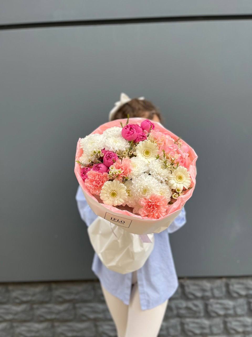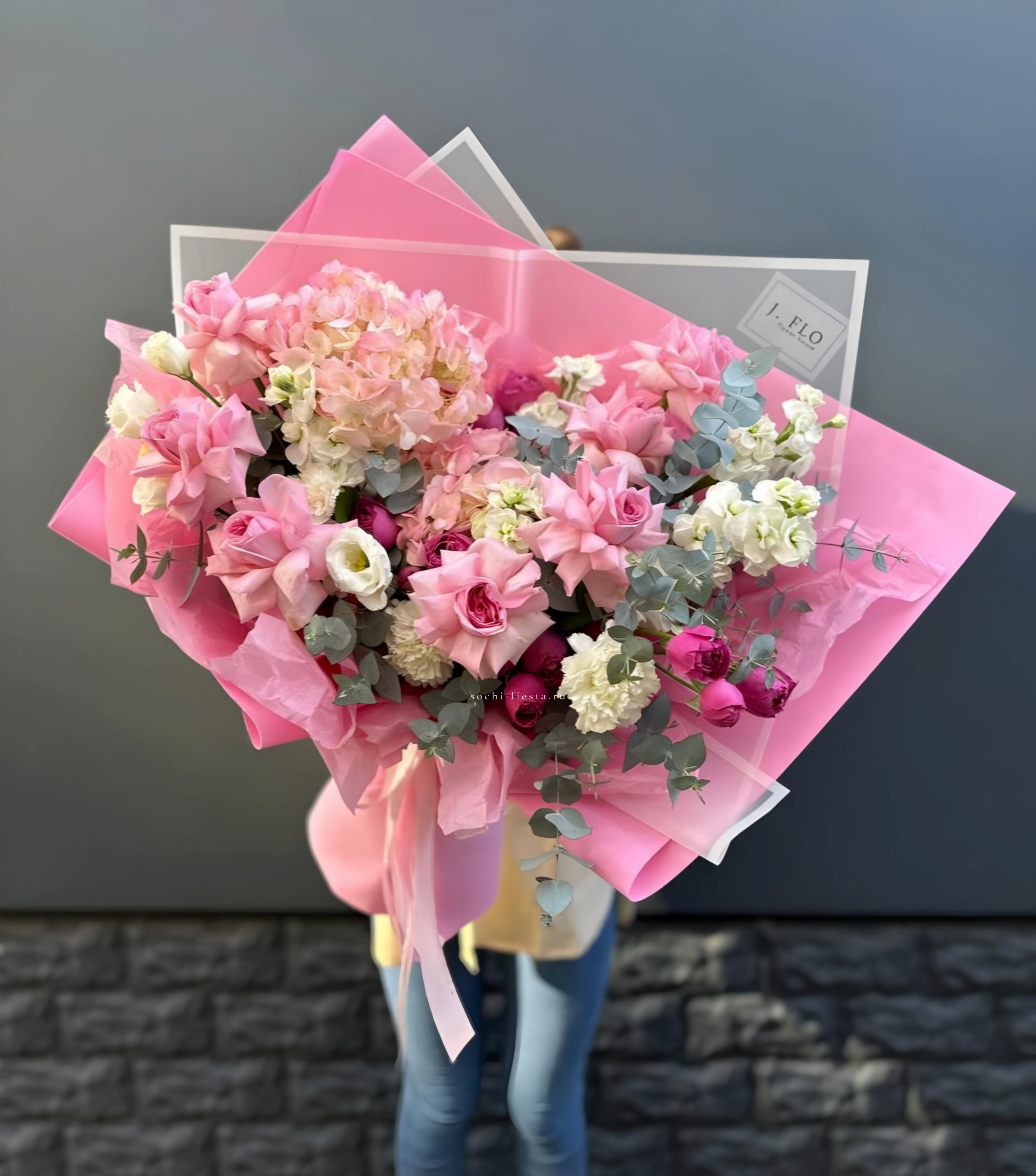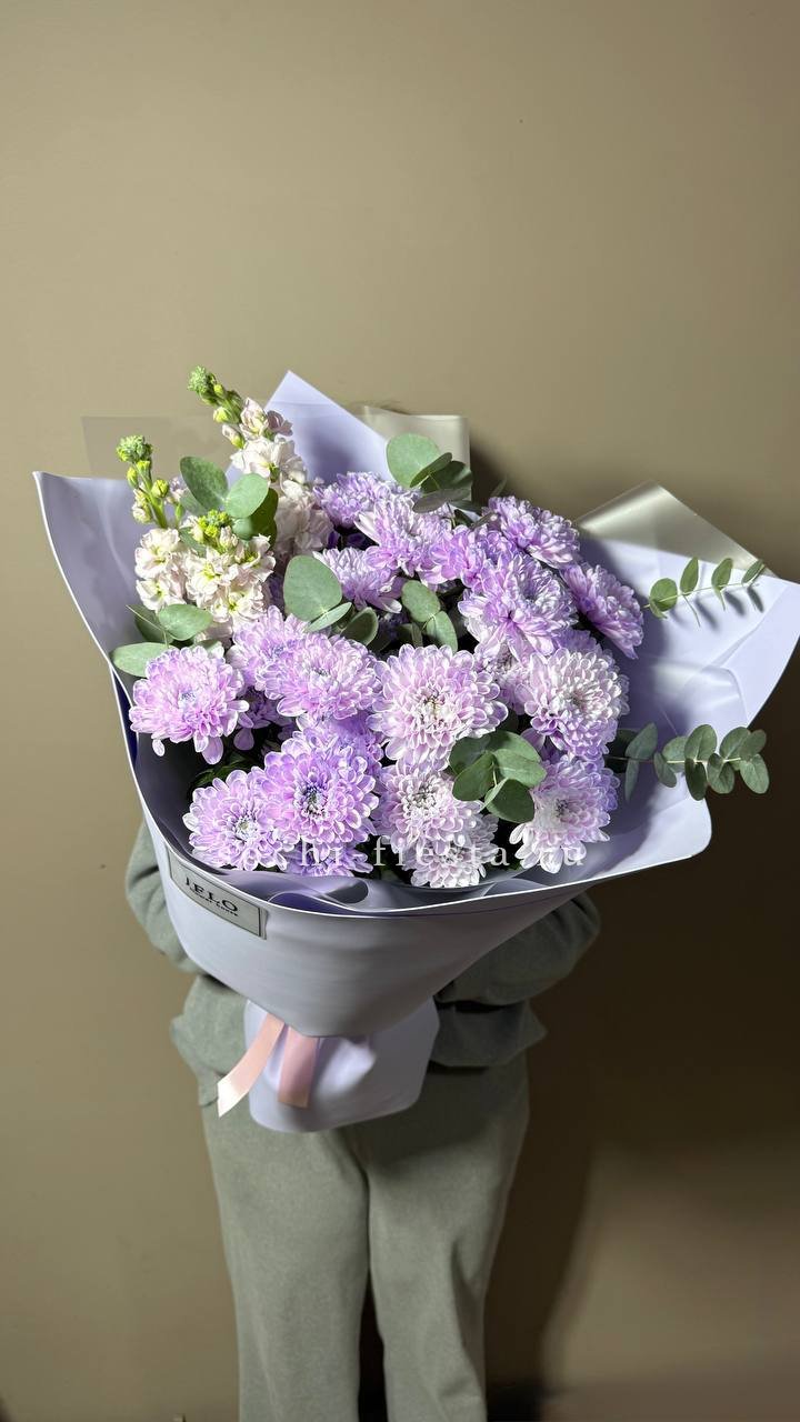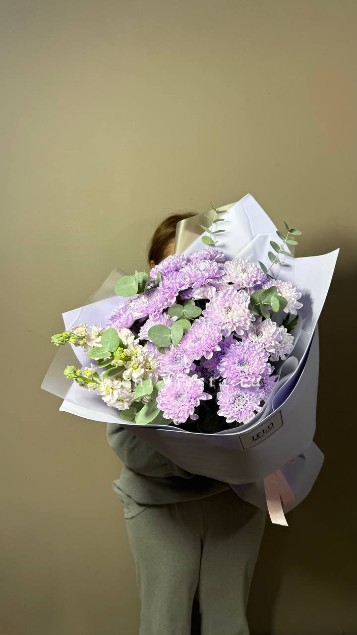 Диантусы и маттиола добавляют букету душистую лёгкость, а гортензия создаёт объёмную основу. Мисти баблс и эвкалипт рисуют воздушный контур вокруг розовых оттенков.