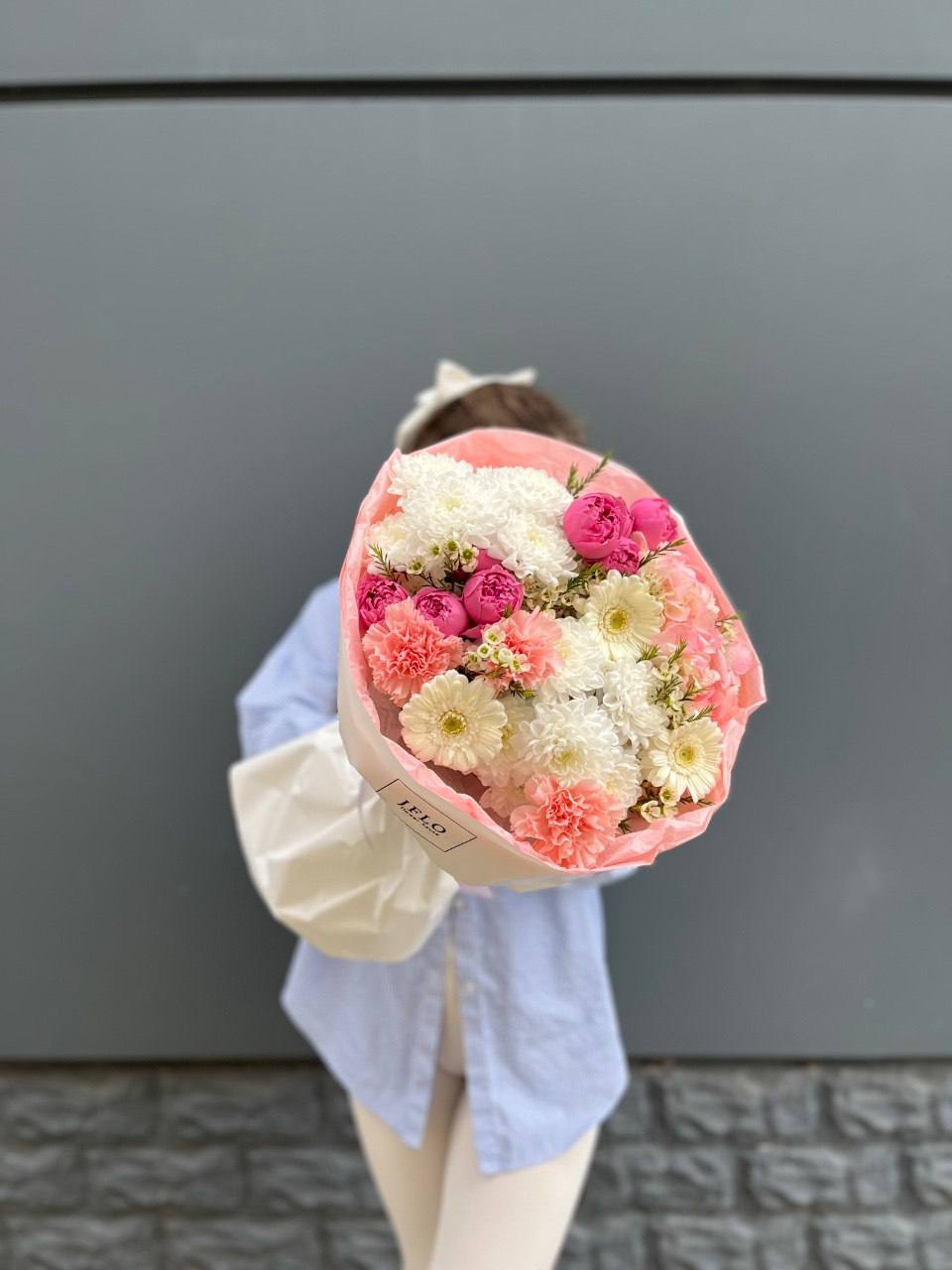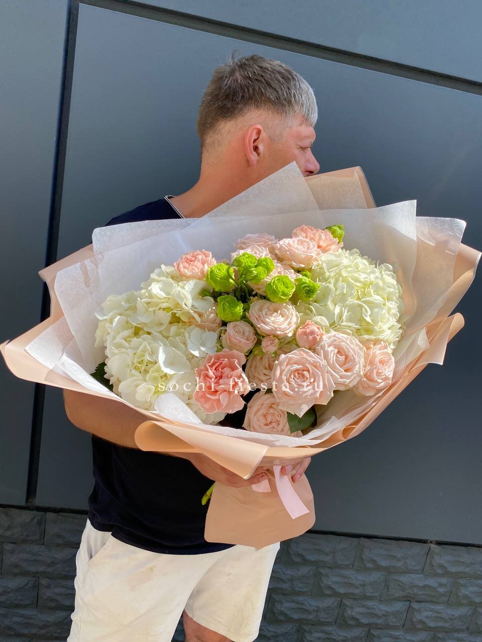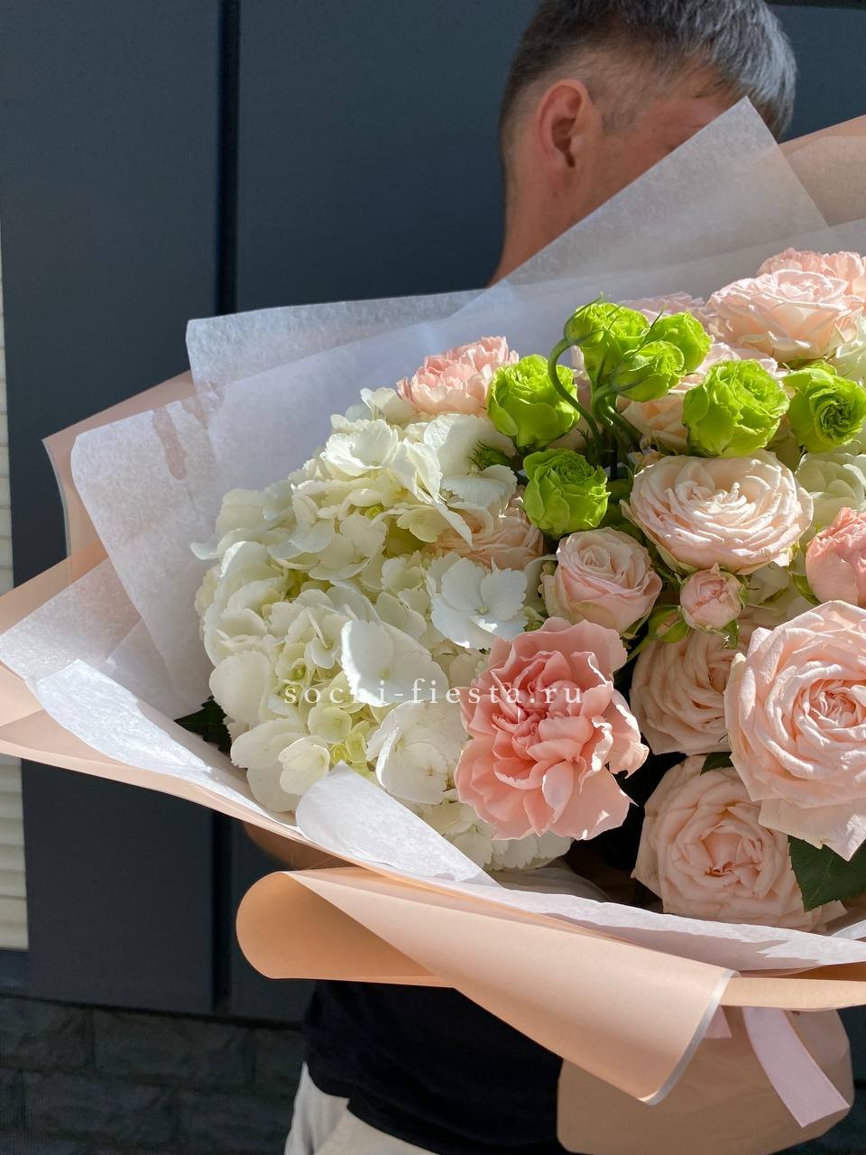 Диантусы и маттиола добавляют букету душистую лёгкость, а гортензия создаёт объёмную основу. Мисти баблс и эвкалипт рисуют воздушный контур вокруг розовых оттенков.