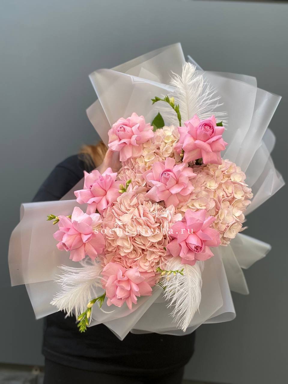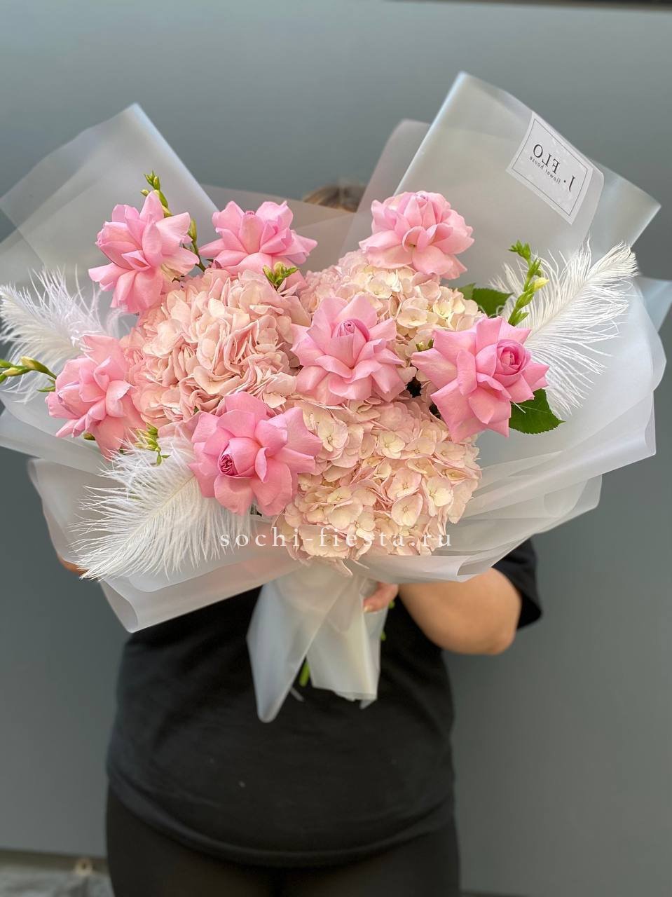 гортензия, роза одноголовая, бомбастик, декоративная зелень, эвкалипт, лента, дизайнерская упаковка.