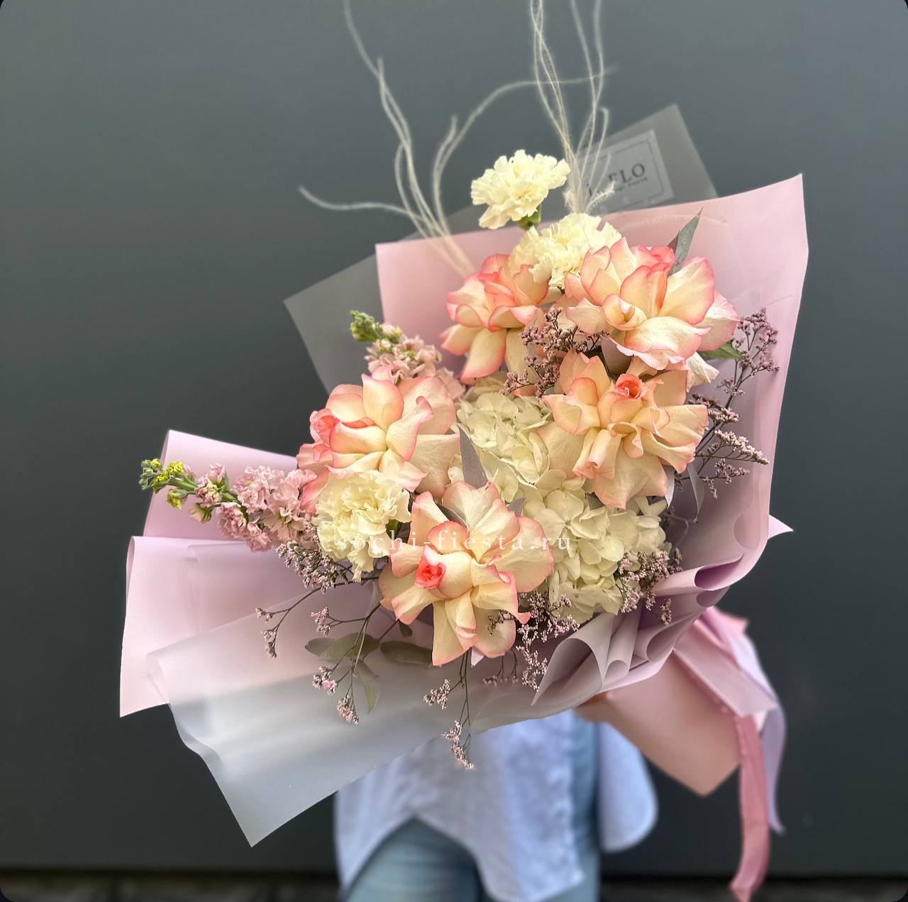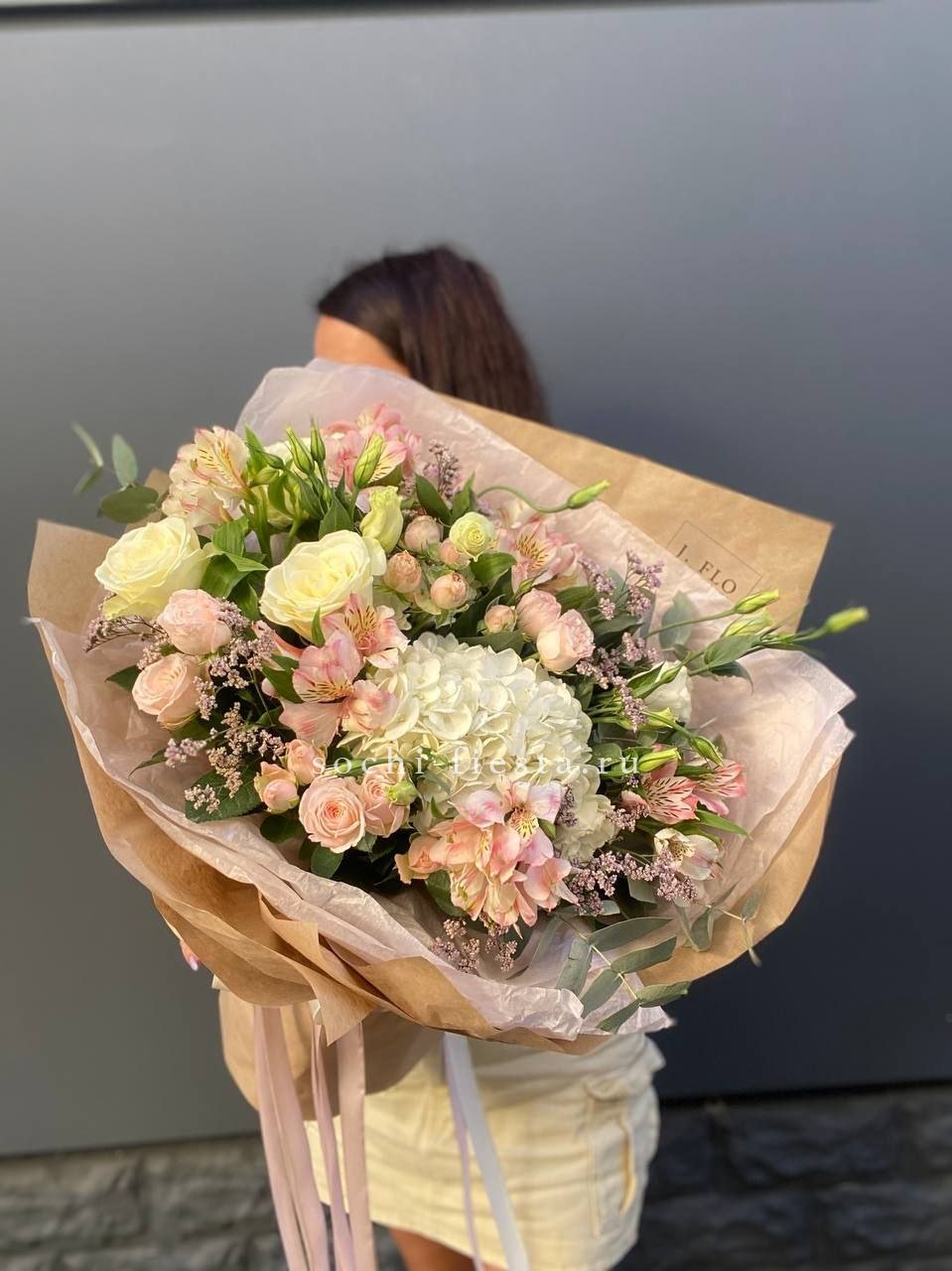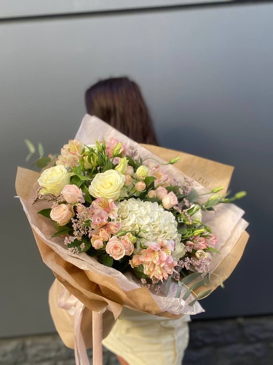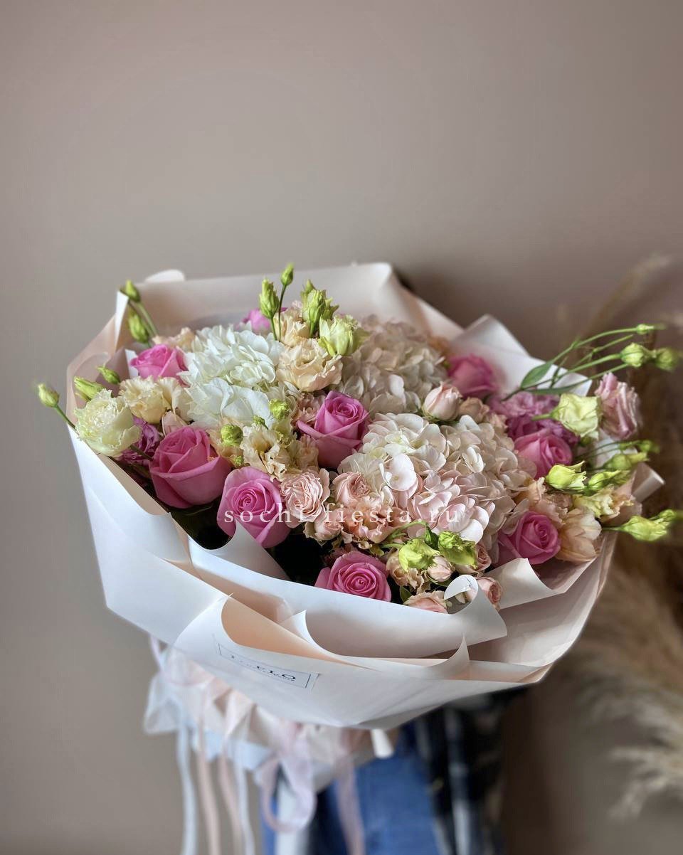 гортензия, диантус, кустовая пионовидная роза, эустома, вспомогательные цветы, эвкалипт, лента, дизайнерская упаковка.