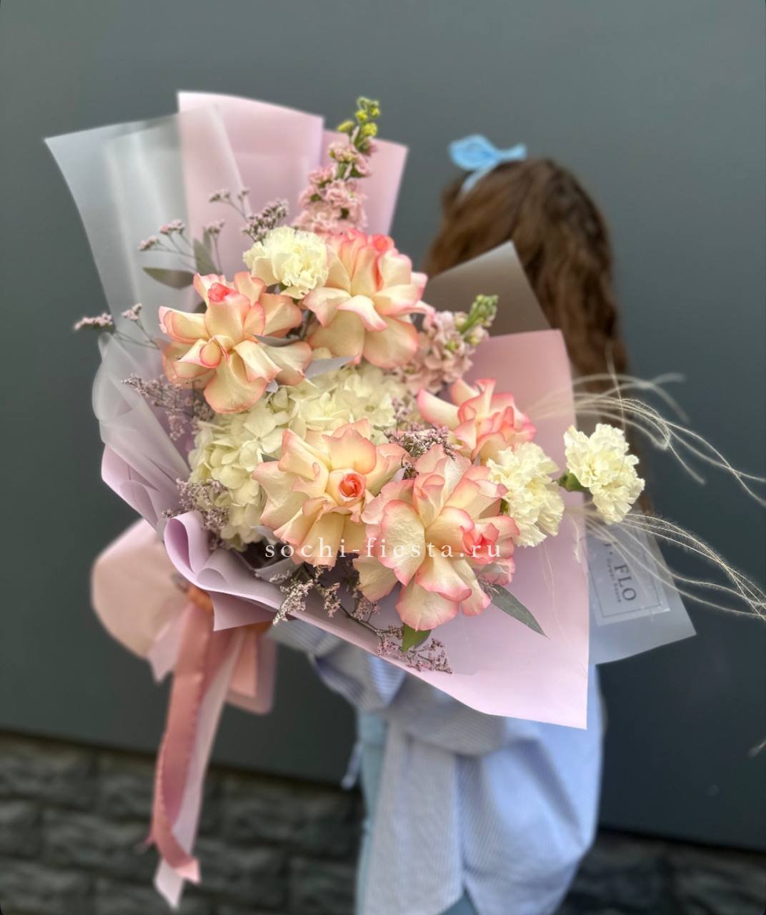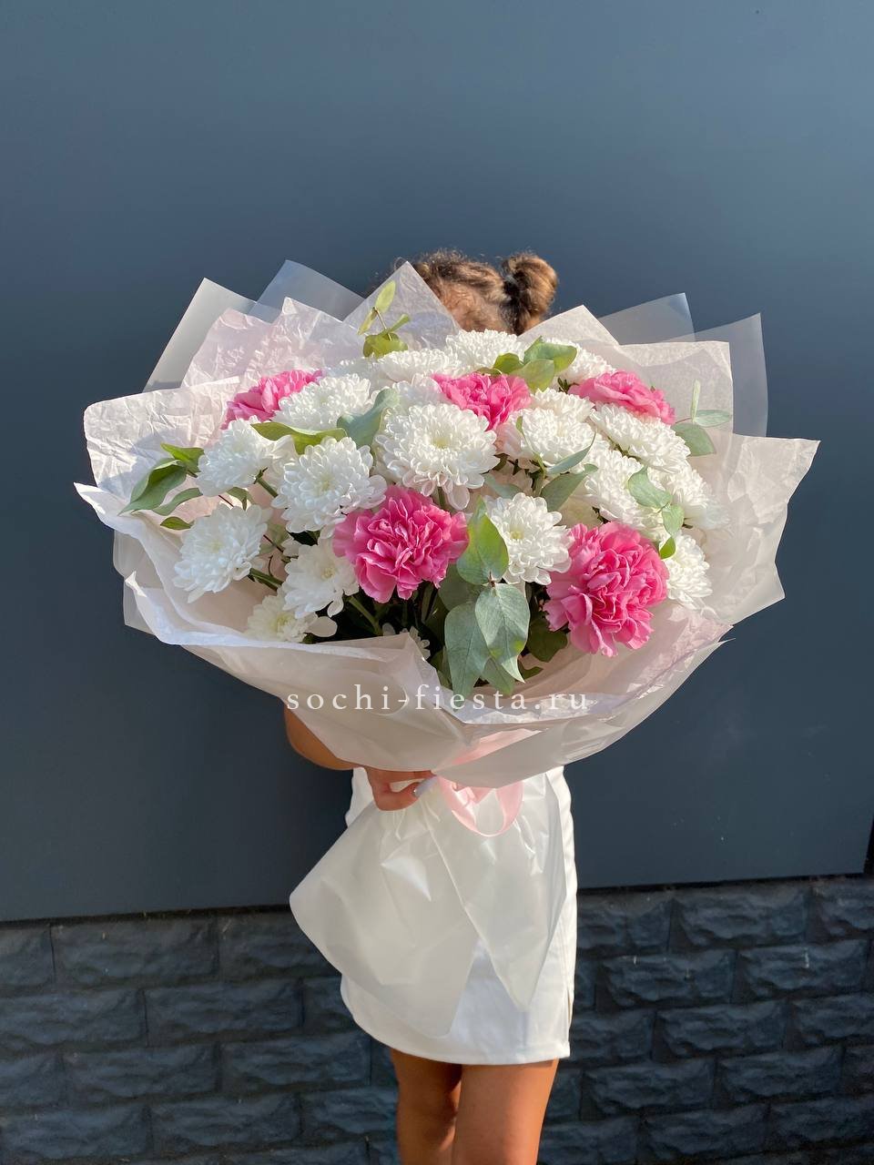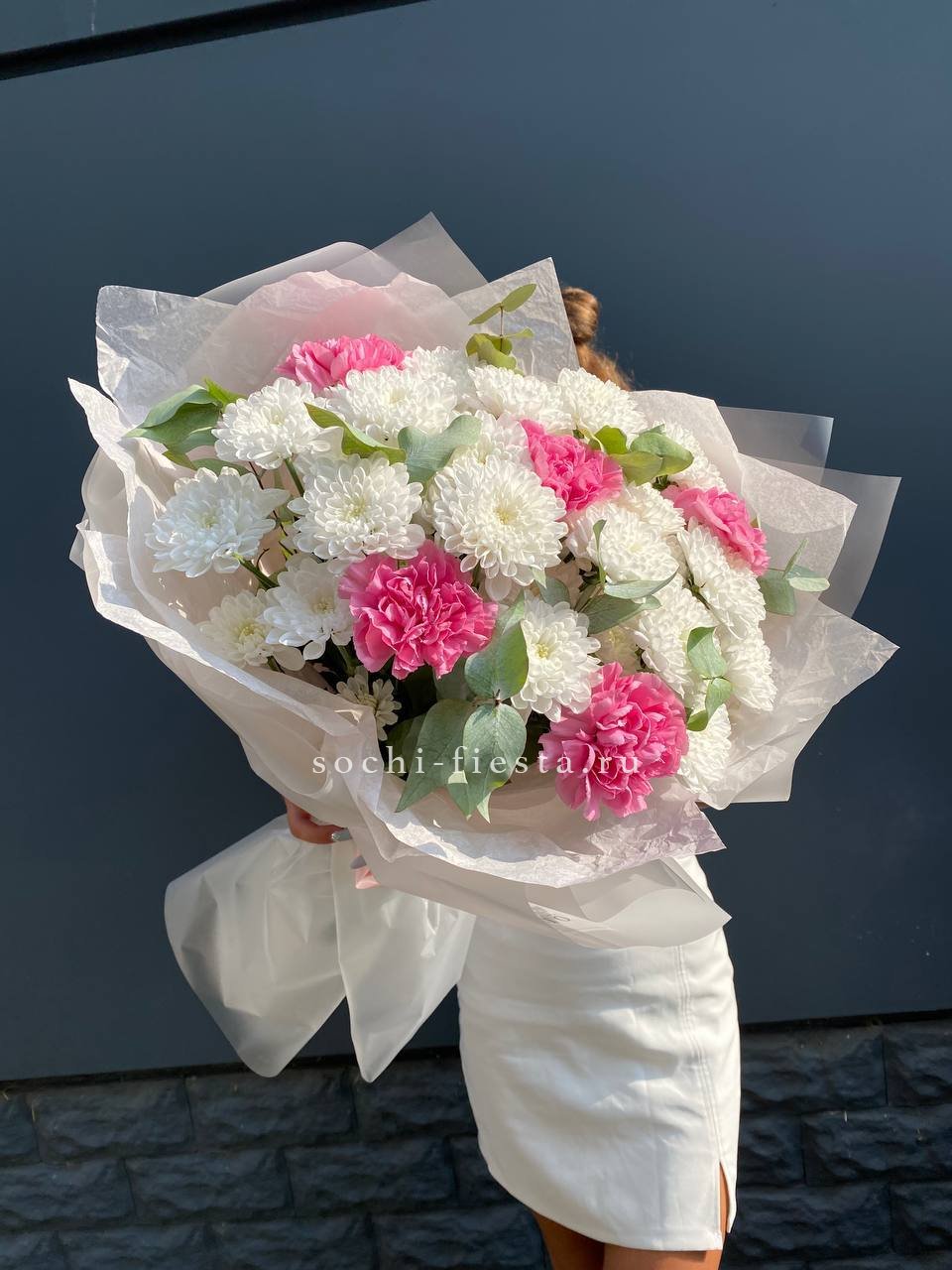 гортензия, диантус, кустовая пионовидная роза, эустома, вспомогательные цветы, эвкалипт, лента, дизайнерская упаковка.