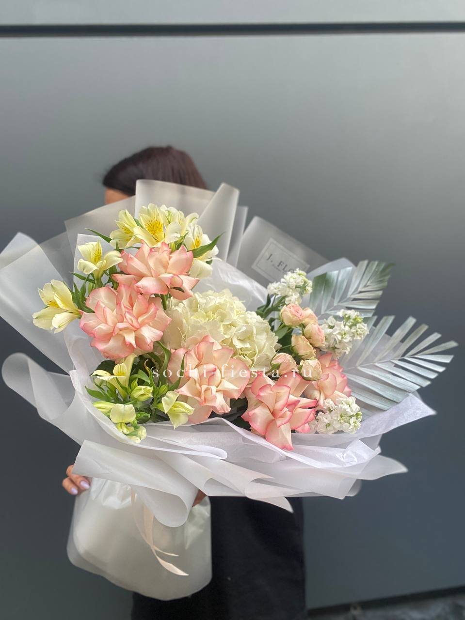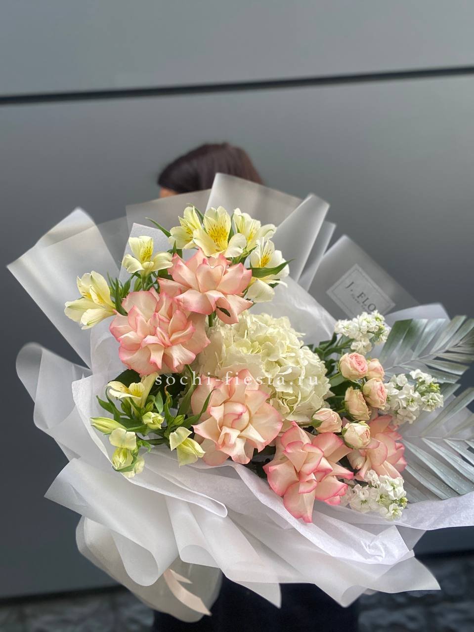 Пышная шапка из гортензии и пионовидных роз собрана с филигранной точностью. Диантус и эустома создают воздушные переходы между крупными соцветиями, а озотамнус добавляет графичные вертикали. Букет для тех, кто понимает язык авторской флористики.