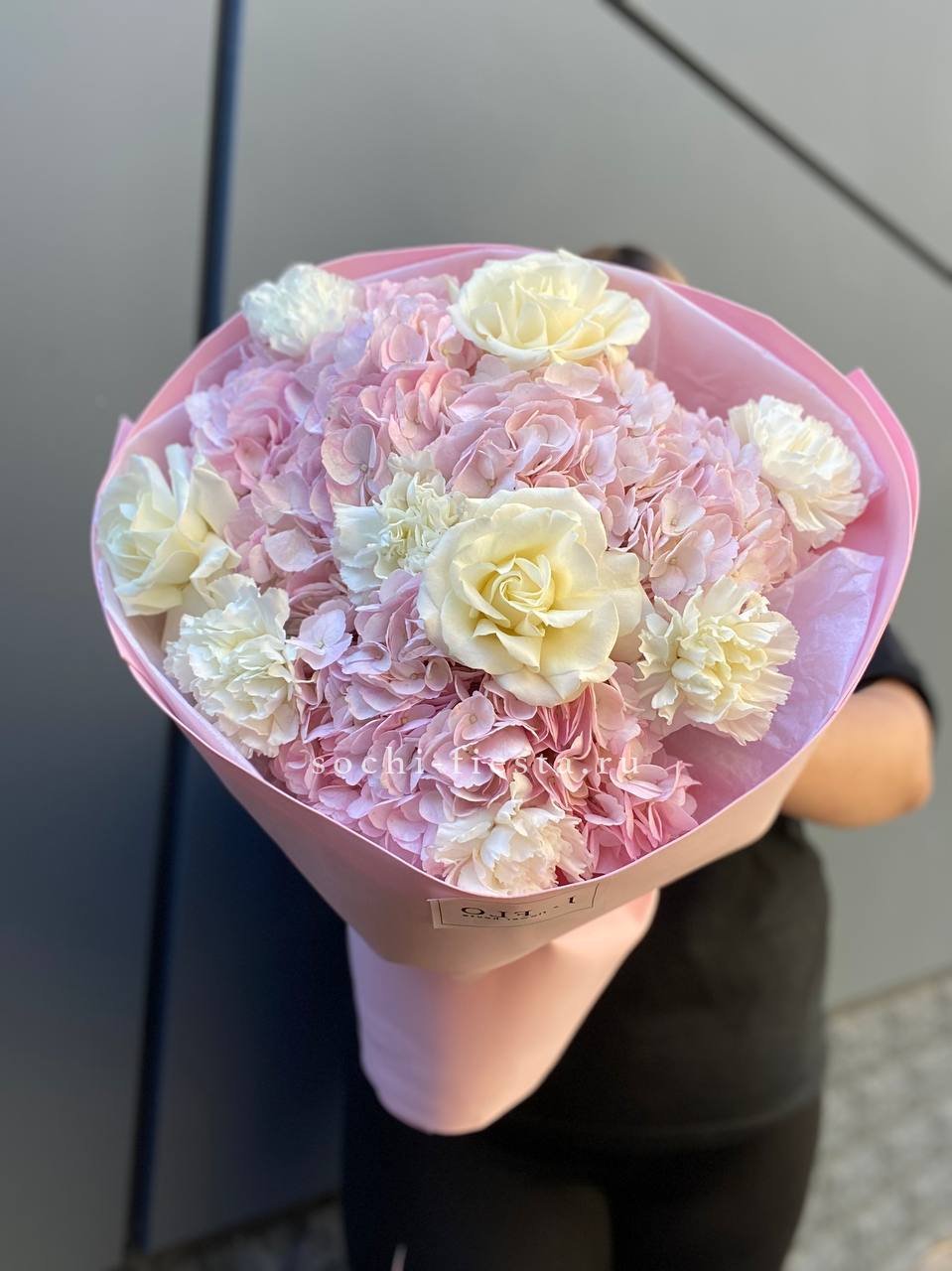 гортензия, пионовидные розы, эвкалипт, пампасная трава, лента, дизайнерская упаковка.