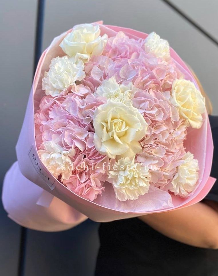 Воздушная композиция с белоснежной гортензией и пионовидными розами в окружении эвкалипта и пампасной травы. Светлая палитра и природная текстура создают ощущение летнего сада. Гармония форм и естественная свежесть в каждом элементе.