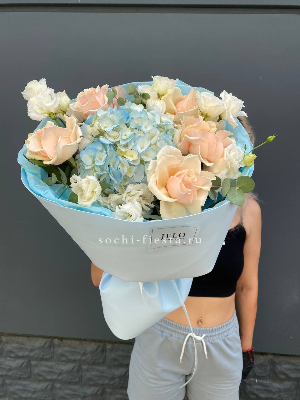 Кремовые розы окружены облаками гортензии, а эустома расставляет светлые акценты по краям. Букет держит форму и при этом выглядит объемно благодаря многослойной сборке.