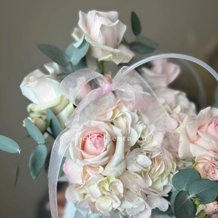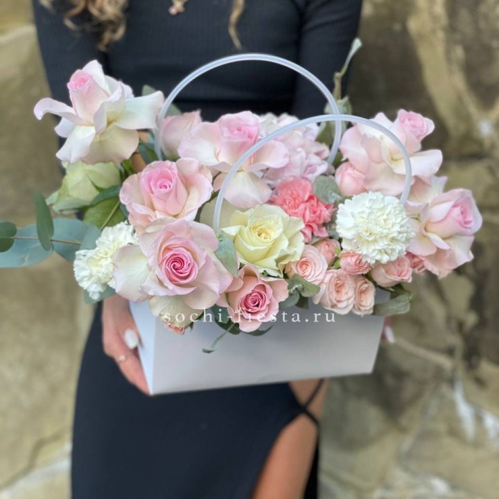 популярная шляпная коробка с пастельными розами и эвкалиптом