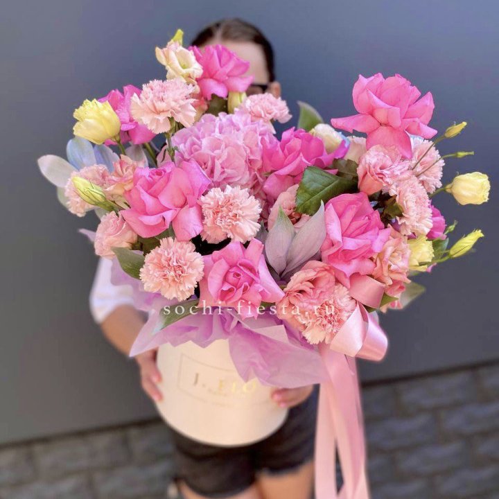 - Шляпная коробка с розами и гипсофилой — универсальный подарочный формат.