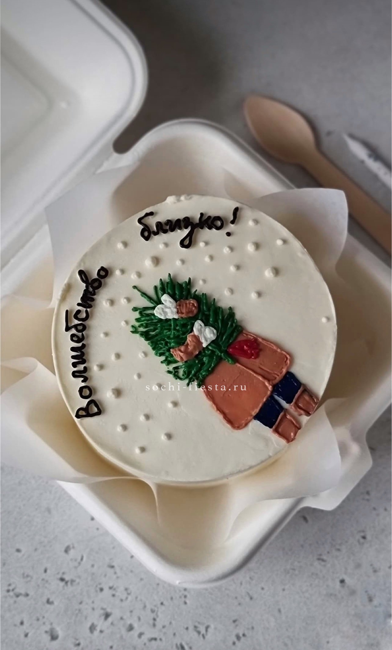 Миниатюрный торт с яркой надписью и домашним теплом в каждом слое. Крем держит форму, а бисквит остается влажным благодаря небольшому объему и свежести выпечки.